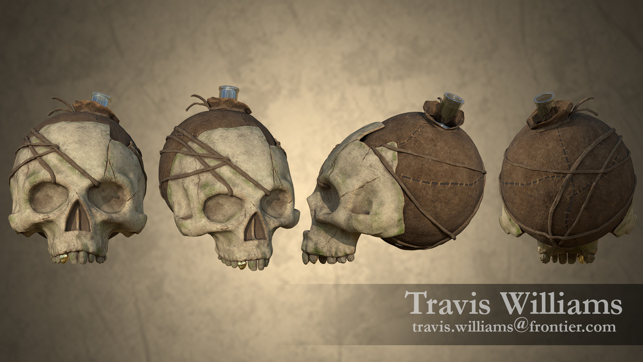 What to use that does not make this go into crazy unbelievable territory? Being minimal and subtle in my opinion. A lot of the materials are strong on there own especially the bone material that I have used, but i wanted to give the skill a little more age. So, I used a moss material and with the help of a black mask allowed me to expose areas that felt subtle and reasonable for moss to grow on the human skull. To give a little more character I gave the previous owner a golden tooth. Cliche possibly, but again angering someone to throw skulls at you becomes crazy enough doesn't it?